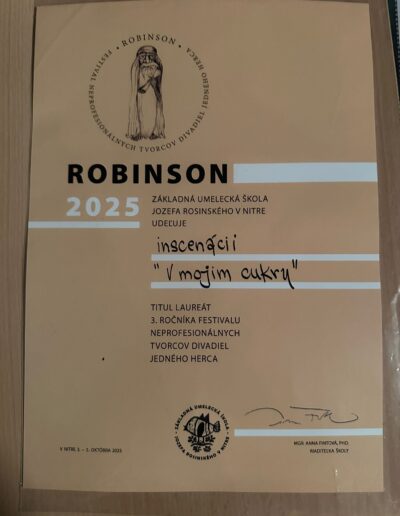 Oliver Vejlupek získal na festivalu Robinson ve slovenské Nitře titul laureáta za inscenaci V mojim cukru v režii Pavla Skály.