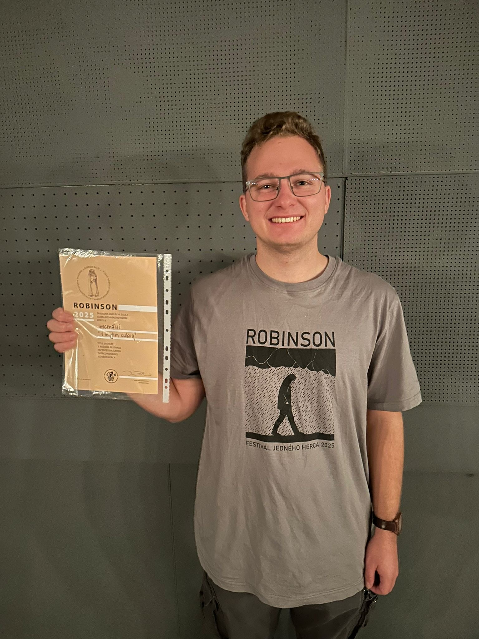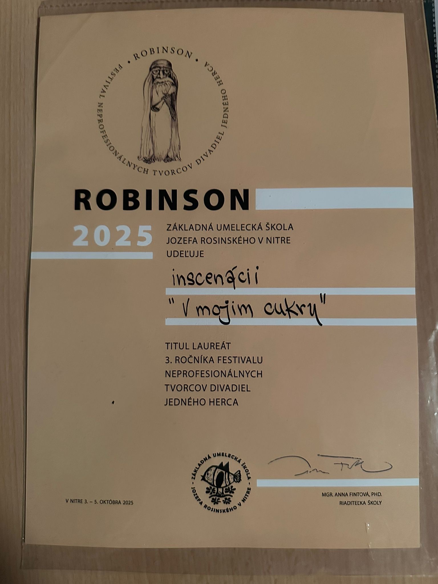 Oliver Vejlupek získal na festivalu Robinson ve slovenské Nitře titul laureáta za inscenaci V mojim cukru v režii Pavla Skály.